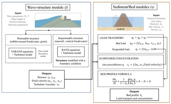 The simple approach decomposes the wave–structure–seabed problem into three modules: (1) wave propagation and transformation with the structure, (2) bed load and suspended sediment transport, and (3) bed morphological changes. Figure 7 shows a summary diagram of the modules, parameters, and the interactions between modules. A detailed description of the modules is given below.