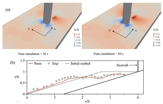 (a) Simulated scour profile (S) around a pile with diameter D induced by the wave action with normal direction to the structure (x-direction) (adapted from Ahmad et al. [69]); (b) simulated scour profile due to the wave breaking impact versus the experimental data of Hughes and Fowler [82] around a seawall (adapted from Ahmad et al. [75]).