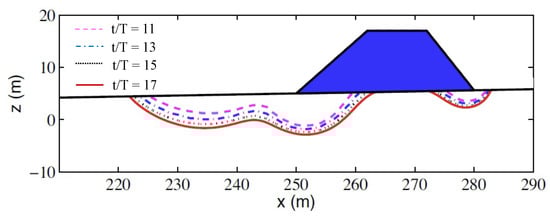 This numerical method is referred to as the simple approach in this paper, because the seabed behaviour is modelled using empirical equations, which are relatively easier to implement in comparison with the other approaches. The simple approach is used, in particular, for estimating the scour around structures with low weight-structure load on the seabed, such as submarine pipelines. Some of the most recent and outstanding studies that used the simple approach for estimating the scour around structures are: Ahmad et al. [69], who investigated the local scour around a composition of pile structures (Figure 8), and, Ahmad et al. [75], who presented the numerical approach for studying scour due to wave impacts on a vertical wall. They showed that the wave-breaking and impact on the structure govern the different stages of the scour formation. Baykal et al. [76] also investigated the flow and scour around a vertical pile. Seabed deformation was modelled while using the mesh deformation technique, which allowed for showing the development of turbulent structures in the wake of the monopile, such as horseshoe vortices. Furthermore, Chen [77] developed a Lagrangian–Eulerian model based on the two-dimensional (2D) Navier–Stokes equations for the wave field, and a bed load sediment transport and morphological model to simulate the scouring process in front of a vertical-wall. Their results tend to underestimate the scouring rate. Gislason et al. [78] calculated the 2D flow and sediment transport in front of a breakwater, coupling a morphological model with Navier–Stokes equations. Their results do not show the seabed movement in detail, a drawback of the simple modelling approach. Li et al. [79] investigated the 2D local scour beneath two submarine pipelines in tandem based on the calculation of the bed/suspended load transport and the morphological changes of the seabed. This work investigated the scour around the pipelines under wave–current conditions. Omara et al. [80] simulated the scour processes, both hydrodynamically and morphologically, around vertical and inclined piers in a new version of FLOW-3D that estimates the motion of sediment transport (suspended, settling, entrainment, and bed load). Tofany et al. [71,72] studied the effects of breakwater steepness and wave overtopping on the scouring process in front of impermeable and vertical breakwaters. They used a 2D RANS-VOF model with additional bottom shear stresses in the momentum equations, coupled with turbulence closure, sediment transport load, and morphological model. Klonaris et al. [81] presented the numerical and experimental results of the evolution of a sandy beach in a surf-zone around a permeable submerged breakwater. They used the Boussinesq-type equations instead of Navier–Stokes equations to simulate wave propagation over a porous bed, coupled with a sediment transport module, including both bed and suspended loads.