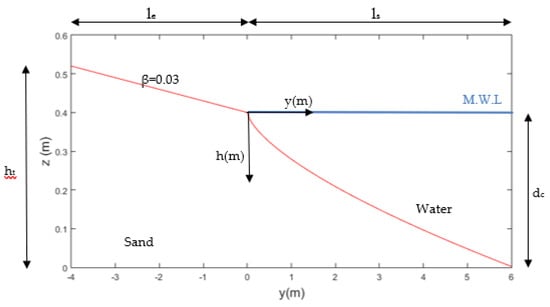 The profile has a submerged length (ls) of 6 m that develops towards a total depth of 0.4 m (defined through Roberts’ [26] formulation 27), which corresponds to the closure depth (dc) and the adopted maximum offshore depth, giving the profile a total height (ht) of 52 cm (Figure 1), with a slope (β) of 0.03. The total cross-shore extension of the beach was of 10 m.