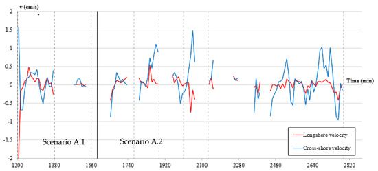 Longshore velocities present a range between −0.75 and 0.55 cm/s, while cross-shore velocities present a larger range, from −0.95 to 1.55 cm/s. The average longshore and cross-shore velocities were approximately −0.05 and 0.08 cm/s for A.1 scenario and 0.01 and 0.11 cm/s in scenario A.2, respectively.