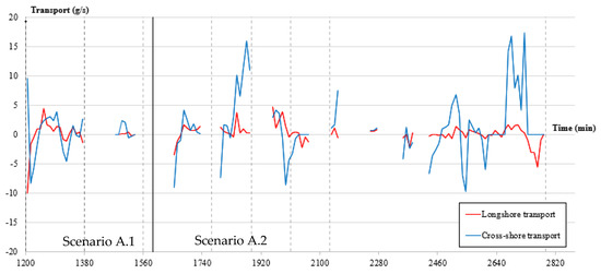 Over the last 6.5 h of scenario A.1 (from t = 1200 min to t = 1590 min), an average value of 0.23 g/s in the direction of the sediment collector (with an absolute maximum peak of 9.92 g/s) and 0.35 g/s in the offshore direction (with an absolute maximum of 14.39 g/s) was obtained for the longshore and cross-shore suspended transport rates, respectively. During scenario A.2, the maximum value of longshore and cross-shore suspended sediment transport rate of 7.68 and 17.36 g/s, respectively, was obtained between 360 t = 2130 min and t = 2790 min (last 11 h hours of tests during scenario A.2). In scenario A.2, the mean suspended longshore transport rate inverted its direction (in the funnel direction) and decreased its magnitude to 0.08 g/s, while the cross-shore suspended transport rate increased to 0.98 g/s (towards offshore). Therefore, while the suspended cross-shore transport is, on average, towards offshore, between scenarios A.1 and A.2, the average longshore transport changes direction (Table 2).