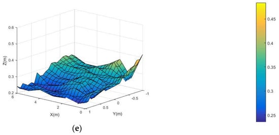 Bathymetric and topographic digital model terrain of the beach over the laboratory tests: (a) t = 0 min; (b) t = 1200 min; (c) t = 1590 min; (d) t = 1590 min (A.2); (e) t = 2790 min.