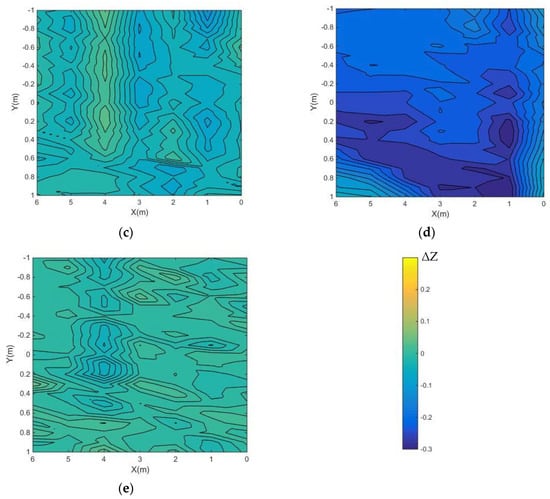 During the first 1200 min of scenario A.1, there was a large erosion of the emerged beach, with sediments moving towards offshore, considering the lower compaction and initial adaptation of the beach profile (Figure 8). This tendency was also observed between 1200 and 1590 min. The deepening of the cross-shore profile at x = 4 m (P5) may arise due to a strong Z (m) rip-currents observed at this location. From the bathymetric data acquired during scenario A.2, a total erosion of the nourishment volume was registered and a bed morphological configuration similar to the end of scenario A.1 was observed. Erosion and accretion volumes’ variation, presented in detail in Table 3, show that every scenario recorded mainly erosion, despite the artificial nourishment construction, as seen in Figure 8c. Comparing Figure 8c,d, it can be observed that the artificial beach nourishment volume disappeared, since the range of vertical accretion (defined by the color range) is symmetric between both figures, and the contour line shapes are similar. A few differences are shown in Figure 8e between the end of scenario A.1 and scenario A.2, with a total difference in the beach volume of −0.03 m3. When comparing the final beach of each scenario, a similar bottom configuration is observed (Figure 7c,e). The results show that the beach tends to an equilibrium that is independent of the nourishment performed and allows the estimation of the time scale of the nourishment existence.