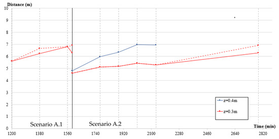 Figure 9 represents the position of the bathymetric contour lines of the P4 profile, z = 0.4 m and z = 0.3 m over time. The contour for z = 0.4 m corresponds to the shoreline and mean water lever (MWL); the z = 0.3 m contour is represented, since the profiler was not able to monitor the complete movement of the shoreline throughout the laboratory tests. Due to the lack of available data concerning the shoreline position, it is assumed that the shoreline presents a similar behavior to the evolution of the z = 0.3 m contour. Thus, the retreat of the z = 0.3 m contour line was used to estimate the average retreat rates for each profile. At some instants, profile P4 intercepted the z = 0.3 m contour twice (from t = 1020 min till the end of scenario A.1), which indicates the presence of a bar. Different colors represent different contour lines, while the dashed lines represent a second profile interception at the same level. All the lines show a general retreat of the cross-shore profile.