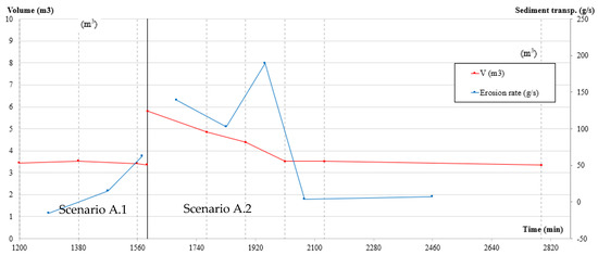 Suspended sediment concentration peaks in scenario A.2, registered from t = 1890 min to t = 2010 min and from t = 2610 min to t = 2790 min, are justified by the introduction of sediments through the nourishment, which also, consequently, led to a distancing of the dynamic equilibrium, or near-equilibrium, beach state. As referred to by [8], beach profiles far from the equilibrium present an increase in the beach dynamics. Just after the placement of the nourishment, there is a quick decrease of the sediment’s volumes in the controlled cell, as shown in the topo-bathymetric variations (Figure 7) and the volumes’ variation describing the durability of the nourishment (Figure 10). For scenario A.1, the total amounts of sediment that left the control volume that were fed at the updrift limit and collected in the downdrift limit were 2086, 1008, and 7632 kg, respectively (in 26.5 h), while the same values, respectively, for scenario A.2, were 3948, 958, and 7560 kg (in just 1200 min). The net erosion rates estimated from the total amount of sediments that left the control volume, obtained by the bathymetric surveys, are 79 kg/h for scenario A.1 and 197 kg/h for scenario A.2. Scenario A.2 registered higher erosion rates leading to a greater loss of sediment volume from the control cell than for scenario A.1. However, the volume of sediments collected at downdrift was greater for scenario A.1. This behavior may indicate that there was a movement of the nourished sediment toward the upper part of the beach profile, or to deeper areas, which were not monitored. Nevertheless, looking at the net sediment transport, estimated from the monitored coastal cell volumes (Figure 10), the initial transport rate in scenario A.2 is superior to scenario A.1.