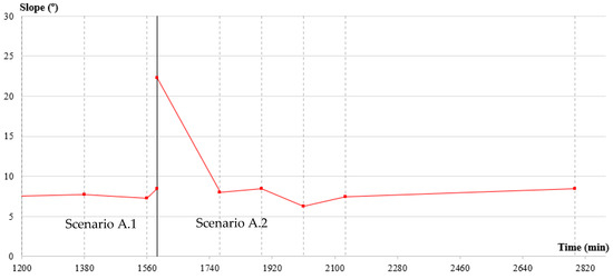 Timeline for mean beach shoreface slope. The vertical black line represents the transition between scenarios A.1 and A.2. The vertical black dashed lines represent the instants when the equipment was stopped.