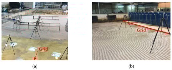 The observed variation of the cross-shore velocity in Figure 4 signal may be explained by undertow currents and bathymetric changes that change the wave breaking location and the relative position of the ADV on the cross-shore profile [34]. Bottom elevation variation near the ADV location may cause the ADV sample to be placed in a different vertical relative position in the velocity profile over time, capturing either lower and upper layers in the water column, leading to variations of the signal’s direction and intensity of the recorded velocities. Scenario A presents an average suspended cross-shore sediment transport toward offshore. This effect can be observed in Figure 12, where the grid near the wave generator system, destined for emptying the basin, was initially set about 3 m away from the cross-shore profile limit at the beginning of the tests, while at the end, the cross-shore profile offshore limit was placed right before that same grid.