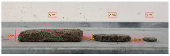 After mixing the components, the dispersion of the nanosilica-based grout was carried out by a pressure pulverizer at 20 °C, penetrating into the surface layer of the sand. After spraying the grout and completion of the gelling time, a homogeneous consolidation of the sand was observed. The result consisted of a pore-filling process and an increase in cohesion of the sand; nevertheless, the nanosilica-based material did not interfere with germination or seedling growth because permeability was ensured. On a control volume, different amounts of nanosilica were tested, defined by a percentage of the grout relative to the voids in the sand. In particular, tested amounts were 5%, 2%, and 1% which resulted in a consolidated sand layer of different depth, hc, and porosity ε (Table 1). In Figure 3, samples of consolidated layers are shown.