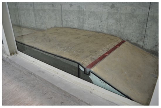 The first part of the experimental campaign was carried out on a horizontal seabed. The experiment was conducted because the wave boundary layer on a horizontal bed is well understood. The bottom shear stress on natural and consolidated sands can be estimated using existing wave boundary layer models. In the wave flume, two concrete blocks with a triangular transversal geometry and 1:3 slope were positioned at a distance of 2 m from each other. The blocks were 0.3 m high, 0.9 m long, and as wide as the width of the flume. The 2-m gap between the blocks was filled with sand. A picture of the first physical model is shown in Figure 4.