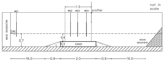 One wave gauge (WG1) was located as close as possible to the wave generator and three wave gauges (WG2–WG4) were used to evaluate the wave conditions over the horizontal seabed and to separate incident and reflected waves in the wave flume. The bed profile was observed with the laser profiler for an extension of 1.5 m on the seabed to avoid the edge effects due to the slopes. A side view of the full experimental setup is shown in Figure 5.