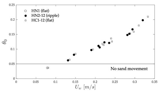 According to Shields, the sediment movement may be observed when a critical value of bed shear stress is reached with a typical value of is of about 0.05 [39]. Figure 6 shows the calculated for each test considering only the skin friction shear stress contribution which acts directly on the sediment grains.