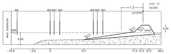 A second part of the experimental campaign consisted of a model beach-dune system located at 23.3 m from the wave generator. The model in the flume had a length of 6.9 m. The beach had a slope of 1/10 by an extension of 5.2 m and a slope of 1/50 by an extension of 0.2 m. The dune length was 1.5 m with a seaward slope of 1/1.5. The dune crest length was 0.5 m, and the dune height above the toe was 0.35 m. These slope gradients are typically observed along the Italian coastline. The still water level (SWL) was chosen in such a way that the part of the beach with a slope of 1/10 was mostly submerged and the part with a slope of 1/50 was fully emerged. Waves were measured using wave gauges WG1-WG7. A side view of the beach-dune system as built with the instrumentation is shown in Figure 7. The origin along the onshore coordinate is taken at WG2. WG1 was located as near as possible to the wave generator to check the accuracy of the wave generation and wave absorption capability of the wave maker. The remaining gauges measured the free surface elevations from the offshore and wave shoaling zones and for reflection analysis following the theory of Mansard and Funke [34]. Given the bathymetry, WG2-WG3-WG4 were placed before the beach and WG5-WG6-WG7 before the dune. In Table 3, the onshore coordinate X (m) and water depth below SWL at each of the seven WGs are listed.
