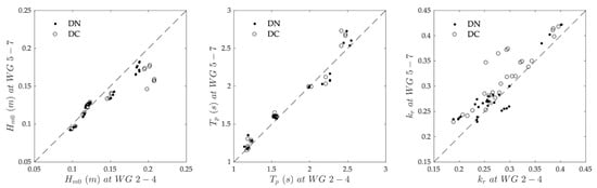 In the beach-dune model, incident wave characteristics observed between the offshore and shoaling zones were analyzed to examine the cross-shore wave transformation. In the DN and DC tests, Hm0, Tp, and kr at WG 2–4 and WG 5–7 were compared and shown in Figure 8 for all the tests with the four runs.