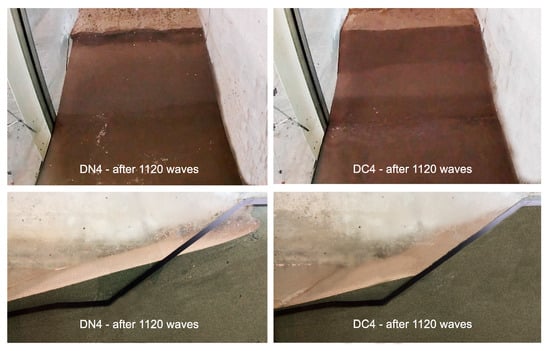 The erosion process of the beach-dune system was observed. Before each new test, the initial conditions of the beach-dune system were restored. It is important to note that it is difficult to exactly reconstruct the same model geometry at the start of each test. Although some geometric parameters were unidentical for all tests (e.g., dune height), the deviation is small enough that they can be considered constant. The process of dune face erosion in the DN tests changed as the test continued. Initially, the slope of the dune face was 1/1.5 (vertical/horizontal). Many waves reach and erode the dune face. The scarped dune front becomes steeper until it is nearly vertical. Then, after a first series of waves within the first run, a different erosion mechanism starts. The dune face only retreats under waves impacting it. Episodically, the dune face collapses and big lumps of sediment fall or slide down the dune face on the beach in front of the dune. This sand is picked up by swash and inner surf zone processes that move the sediment further seaward extending the new foreshore. At this stage of the erosion process, the number of waves impacting the dune is certainly lower, consequently the erosion rate is reduced. In the DC tests, the injection of the nanosilica protected the surface layer of the dune exposed to run up, so the erosion process did not take place in the first series of waves, as in the DN tests. The dune face remained unchanged for a higher number of waves. A front and side view of the cross-shore profile after four runs of DN4 and DC4 is shown in Figure 9 in order to appreciate the effect of nanosilica on the dune face.