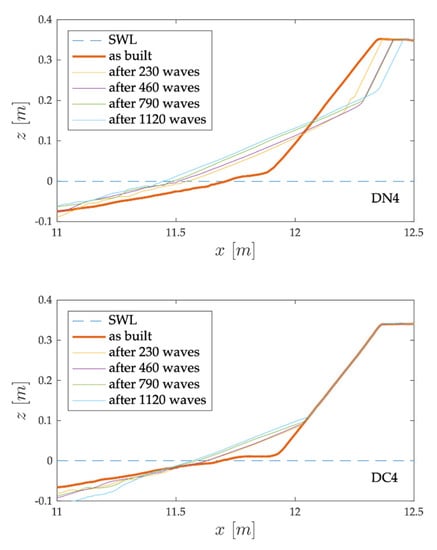 The cross-shore profiles of the beach-dune system were evaluated by the laser profiler attached to a mobile platform with x-axis defined positively onshore from x = 11 m up to x = 12.5 m (see Figure 7). Before the start of each test as well as after every wave run, profiles were recorded along the centerline. The profiler velocity was set in order to have a horizontal resolution of 0.2 mm. Figure 10 presents the comparison of the observed cross-shore profiles of DN4 and DC4.