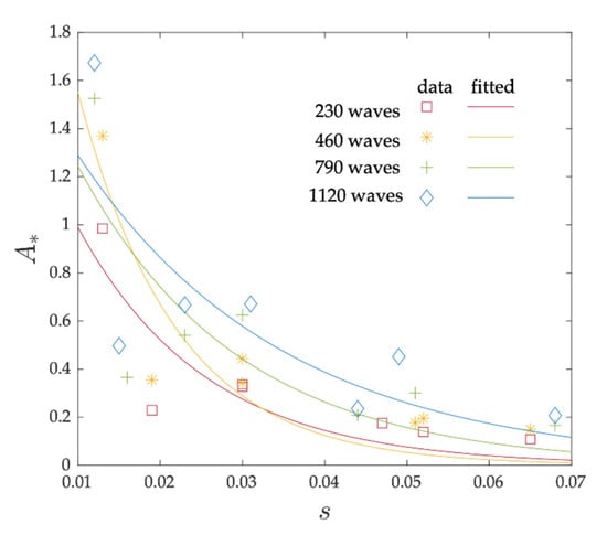 Based on the analysis of the test results, the effect of Tp on dune erosion in terms of was evident. In particular, was larger for lower values of s, confirming its dependency on Tp in accordance with van Gent et al. [40].