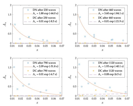 Normalized eroded area after 230, 460, 790, and 1120 waves as a function of wave steepness s for tests DN1-DN7.