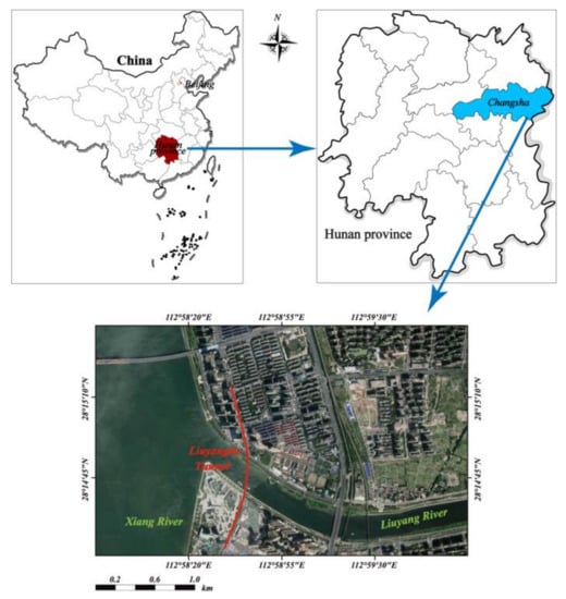 The Liuyanghe Tunnel is a controlling project for the Wuhan–Guangzhou Passenger Dedicated Line. It is located in the east of Changsha City and crosses the Niujiaochong Interchange between the Beijing–Zhuhai Expressway and the Changyong Expressway, the dense plant area of Xingsha Town, Yuanda Road, Changsha City, People’s East Road, Liuyang River, and Airport Expressway; it exits the ground in Lituo Township and ends at the new Changsha Station, as shown in Figure 1. The tunnel ground structure is complex, and its exposed strata are mainly quaternary artificial fill, silty clay, sandy gravel stratum, Cretaceous argillaceous sandstone, conglomerate, sandstone, and calcareous sandstone. From top to bottom, the groundwater of the tunnel comprises loose rock pore water, clastic rock pore fissure water, and clastic rock pore fissure–karst cave water. The fault structure of the tunnel site area is not developed, and there are no large faults. However, there are factors such as uneven weathering, an uneven lithology, and the development of karst caves. The seismic basic intensity in this area is VI degree, and the peak acceleration of the ground motion is divided into 0.05 g.