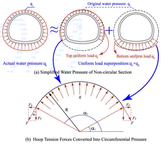 For a noncircular high-speed railway tunnel structure, the cross section mainly consists of the top arch sections (arch crown and arch foot) and bottom arch sections (inverted arch). Hence, the uneven water pressure acting on the tunnel structure is simplified as the evenly distributed load acting on the top and bottom sections. Using Equations (4)–(6), the hoop tension forces in the top part (F1) and bottom part (F2) were determined according to the accumulations of the equivalent force acting on each arch section. The internal stress from the simulation matched the actual water-pressure effect.