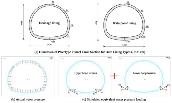 Depending on whether the secondary lining structure can withstand the water pressure, lining designs can be divided into two types: waterproof and drainage. The cross-sectional dimensions (secondary lining) of both lining types are shown in Figure 3a. To verify the equivalence of the water-pressure loading simulation, taking the waterproof-type lining section of a 350 km/h high-speed railway tunnel as example, a finite-element model was established for the comparative analysis of the internal lining stress between the actual water pressure and the simulated water pressure within the depth range of 10~100 m. The actual water pressure was applied directly to the lining (as shown in Figure 3b) through equivalent nodal loading, and the simulated water pressure was applied through a prestressed hoop tension load at both ends of the top and bottom sections of the lining, as shown in Figure 3c. The hoop tension forces (x- and y-axis components) in the top and bottom sections were calculated using Equations (4) and (5) and are presented in Table 1.
