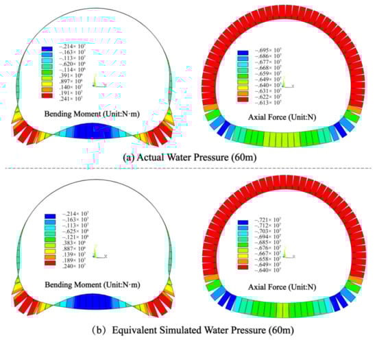 Two-dimensional load structure models of actual water pressure and equivalent water pressure were established, respectively, with finite element software ANSYS 15.0 to test the reliability of equivalent simulated water pressure loading. The internal forces (moment and axial loading) in the waterproof lining under a 60 m water level for the actual water pressure and the equivalent simulated water pressure are compared in Figure 4. The comparison indicates that the internal lining stress distribution under the simulated water pressure agreed well with the actual water pressure. The maximum positive and negative bending moments occurred at the inverted arch and bottom of the wall, and the maximum and minimum axial forces occurred at the bottom of the wall and the inverted arch, shown in Figure 4. The internal forces were largest at the inverted arch and the bottom of the wall. Hence, these locations were adopted to examine the consistency between the actual water pressure and the equivalent simulated water pressure with the underground water level ranging from 10 to 100 m. The relative error between the actual and simulated cases is shown in Table 2.