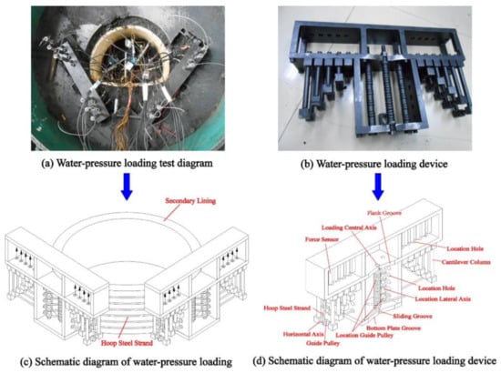 For load condition 1 (only water pressure), model tests with the scaled lining structure (both waterproof and drainage types) were performed in which prestressed radial forces were applied stepwise to the top and bottom parts, separately. The initial water pressure was 10 m; the equivalent hoop tension force is presented in Table 1. At each step, an additional water pressure of 10 m was applied to the scaled model until the model failed. Hence, through the tests, the patterns of the internal force regular patterns for both the waterproof and drainage linings under changes in the water pressure were obtained. Additionally, the ultimate water pressures and failure modes were determined.