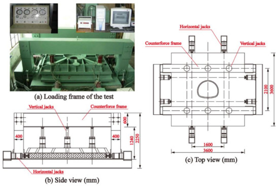 In the similitude model test, the device used to apply the soil pressure around the tunnel was horizontally laid on the ground, and its dimensions were 3.60 m × 3.60 m × 0.30 m, as shown in Figure 6. The scaled tunnel model and similitude soil were placed inside this loading device. The hydraulic jacks and loading panels were installed in the perpendicular direction of the tunnel cross section so that the scaled tunnel remained in the plane stain deformation state during the loading process. Soil pressure was provided by horizontally installed hydraulic jacks on four sides and applied to the main structural model using similitude soil. The soil-pressure coefficients on different sides were simulated by changing the outputs of the hydraulic jacks in two directions and their ratio.