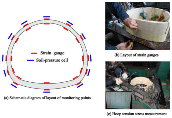 The layout of the stress and strain gauges on the scaled tunnel model is shown in Figure 7. Differential voltage displacement sensors with a resolution of 1/100 were placed at the arch crown, spandrel, haunch, arch springing, bottom of the wall, and inverted arch, and the interface contact pressure between the primary lining and the secondary lining was measured using a soil-pressure load cell. Gauges were also placed at corresponding locations on the excavation surface, along with a precise soil-pressure box, to measure the soil pressure on the secondary lining. Strain gauges were installed both inside and outside the lining structure to measure its deformations under loading. The internal stress of the lining was then calculated using the strain measurements.