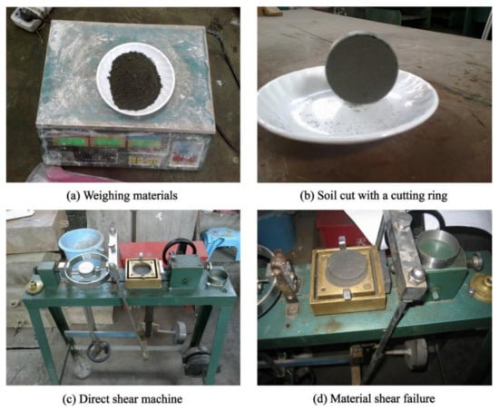 For examining the mechanical characteristics of Class IV surrounding rock with different types of tunnels, a direct shear test was performed to determine the physical and mechanical parameters of the similitude soil model under different loads. The soil shear strengths under different pressures were determined in these tests. Additionally, the shear-strength indices were determined, including the cohesion C and internal friction angle φ. The parameter measurement device is shown in Figure 8, and the prototype and scaled-model mechanical properties are presented in Table 3.
