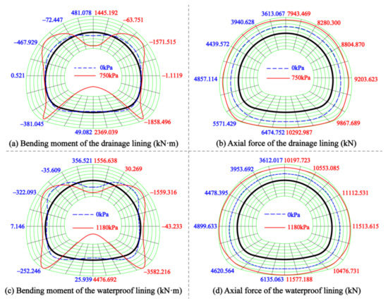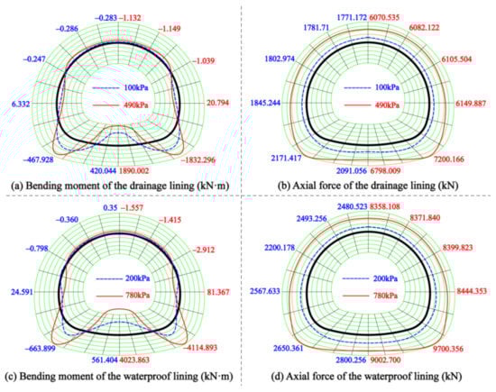 For the drainage lining, the following two water pressures were selected: 0 kPa (constant soil pressure of 0.8 MPa) and 750 kPa (ultimate failure state). For the waterproof lining, the following two water pressures were selected: 0 kPa (constant soil pressure of 0.8 MPa) and 1180 kPa (ultimate failure state). The distributions of the bending moment and axial force for the two linings (drainage and waterproof) are shown in Figure 13.
