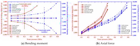 As shown in Figure 13, under the effect of the variable water pressure and constant soil pressure (0.8 MPa), the two lining structures (drainage and waterproof) exhibited different distribution patterns and characteristics of the internal forces (bending moment and axial force) from the general stress state to the ultimate failure state. The distributions of the internal forces (bending moment and axial force) for the two lining structures (drainage and waterproof) from the general stress state to the ultimate failure state are described as follows.