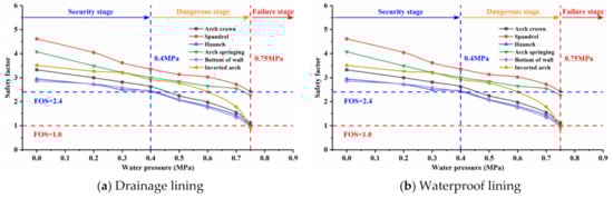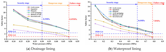 The curves of the safety factor for key points of the drainage and waterproof linings with respect to the water pressure are presented in Figure 15. The following observations are made.
