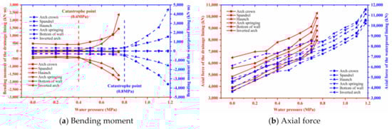 The curves of the internal forces at key points of the drainage and waterproof lining with changes in the water pressure for the entire test are presented in Figure 10. As shown, the positive bending moment of the inverted arch and the negative bending moment of the bottom of the wall increased linearly, with an increase in the water pressure in a certain range (drainage lining: water pressure of <0.3 MPa; waterproof lining: water pressure of <0.6 MPa), and then exhibited the change characteristic of nonlinear failure. Among the parts of the tunnel lining, the absolute values of the positive and negative bending moments were the largest for the inverted arch and the bottom of the wall, respectively. The bending moments of the other parts were essentially unchanged, with small absolute values and minimal differences. The axial force increased linearly with an increase in the water pressure in a certain range (drainage lining: water pressure of <0.4 MPa; waterproof lining: water pressure of <0.6 MPa) and exhibited little difference among different parts. Thus, the bottom of the wall and the inverted arch were the two weakest parts of the lining structure under the action of water pressure.