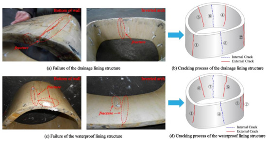 Throughout the loading process, the failure modes of the drainage- and waterproof-type lining structures were roughly similar, indicating that the arch crown and inverted arch were concave towards the excavation face and that the bottom of the wall on both sides was convex outwards. For both types of lining structures, first, compression and shear failure occurred at the bottom of the wall, and then cracks appeared on the outside of the bottom of the wall. Then, compression and shear failure occurred in the inverted arch, and cracks appeared on the inner surface. The failure of the lining structure under the action of only water pressure is shown in Figure 12.