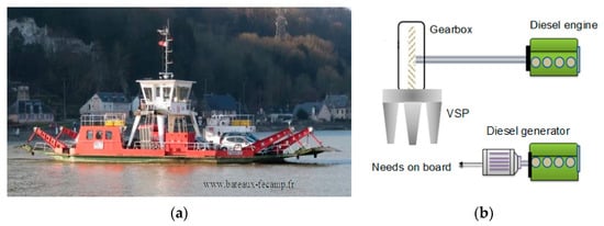 Studied river ferry (a) and simplified schema of its conventional propulsion (only one set of diesel–gearbox–propeller is represented) (b).