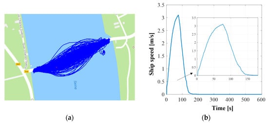A Global Positioning System (GPS) has been used to record the trajectories and speeds of the ferry during two days of operation in favorable weather conditions (Figure 2a). By statistical analysis (filtering and averaging) of the acquired data, a reference speed profile for one river crossing was determined, as shown in Figure 2b.