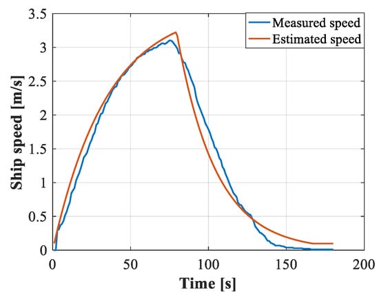 For a constant thrust (step response), the temporal expression of the ferry speed during the acceleration (80 s) and deceleration phases is given as follows, where u(t) is the Heaviside function:
