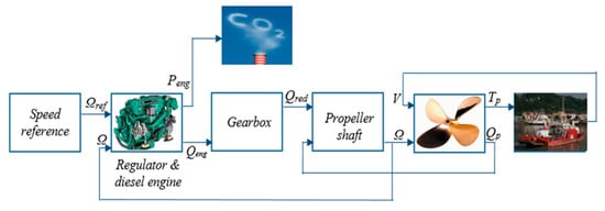 A multidisciplinary and configurable modeling simulator has been developed on Matlab/Simulink [10,11,12]. The ferry hull is model is given by (1), with the resistance to advance determined experimentally using Equation (2). A four-quadrant (Ct, Cq) model is used to model the propeller in terms of torque and thrust for any operating points as in [12]. The propeller shaft dynamic model (I dΩ/dt = Qred − Qp) involves the moment of inertia (I) of all the rotating parts, and the gear box is represented by a reduction ratio (Kred) and an efficiency (ηred), giving Ωeng = Kred Ω and Qred = ηred Kred Qeng, where Qeng and Ωeng are respectively the diesel engine torque and rotating speed, and Qp and Ω are respectively the propeller torque and rotating speed (Figure 4). The diesel engine is represented by the dynamic model given in [19].