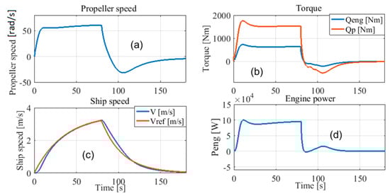 Simulation results: (a) propeller speed, (b) engine and propeller torques, (c), reference and measured ship speeds, (d) engine power.