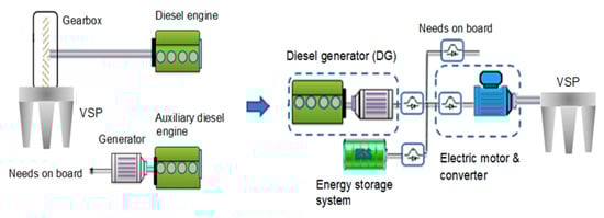 River ferries are generally flat-bottomed boats that allow vehicles and passengers to move from one river shore to another. They have a shallow draft, in order to be able to dock very close to the shore. The present study concerns a river ferry operating on the Seine River in France, with a carrying capacity of 12 cars and 50 passengers. The initial existing design (using conventional diesel propulsion) has two independent propulsion chains. Each chain consists of a diesel engine connected to a Voith Schneider propeller (VSP) via a drive shaft and a gearbox. The electrical requirements on board are provided by a diesel generator (Figure 1). The main characteristics of the system are listed in Table 1 [18]. We can notice that the rated power of the propellers is about 66.25% of the rated power of the diesel engines. This percentage represents the efficiency of the propellers at their optimal rotating speed (854 rpm).