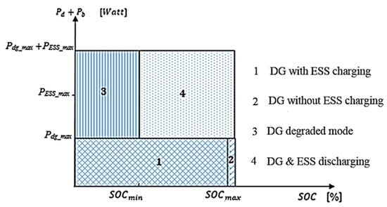 In the first zone (area 1 in Figure 6), the power demand is lower than rated power of the DG and the ESS is not fully charged. The DG provides the power demand and allows the ESS charging: