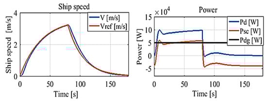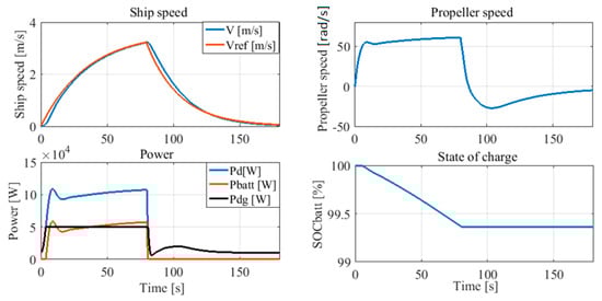 The fitted ship speed (Figure 3) is used as reference. The simulation results are given in Figure 5. The power developed by the diesel engine increases rapidly until it stabilizes around 100 kW. Then, during the deceleration phase, the propeller shaft speed decreases and becomes negative (astern thrust). The torque becomes negative, which indicates that we are in the braking mode. The maximum power reached in this phase is around 30 kW.