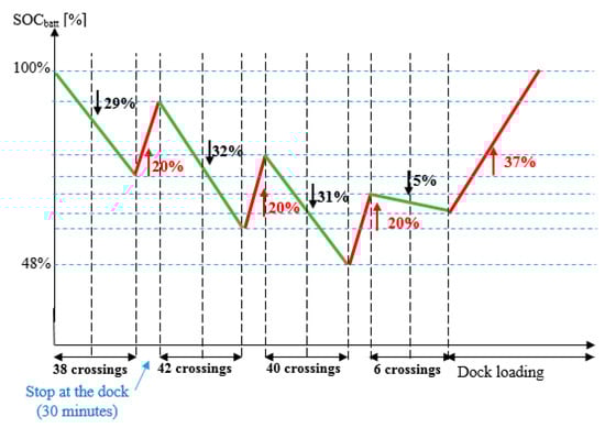 The sizing of the batteries must satisfy the power demand (Equation (4)) and various environmental constraints, such as space requirements. Battery life is also strongly affected by the number of charge and discharge cycles and the SOC [21]. To extend the battery life, the recharging should only be carried out after several operating cycles, while maintaining a minimum state of charge (SOCmin). Plug-in recharging during docking (via the power grid) is done during the night, when the boat is not in service (full recharging), and during additional partial recharge phases during the 30 min stops (after 40 trips). If necessary, in order to reduce the amount of batteries required, other recharges can be carried out during the dockside stop times in some trips. Lithium-ion batteries are chosen. The results of the batteries sizing are given in Table 5, and their recharging strategy is illustrated in Figure 9.