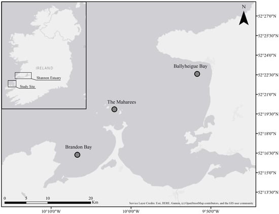 Map of the monitoring locations. C-PODs were deployed at Ballyheigue Bay, Brandon Bay and the Maharees, indicated by the grey circles. The Shannon Estuary (and the associated Lower River Shannon SAC) are located to the north of the study sites.
