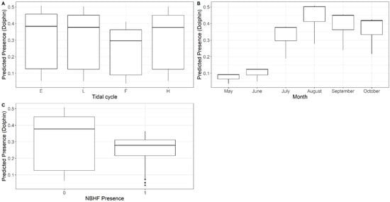 The predicted probability of bottlenose dolphin presence at Brandon Bay according to: (A) tidal cycle, where “E” = ebb tide, “L” = low tide, “F” = flood tide, and “H” = high tide; (B) month, from May to October; (C) harbor porpoise (NBHF) presence, where “0” represents the absence of harbor porpoises, and “1” represents harbor porpoise presence.