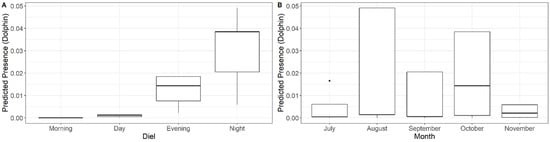 The predicted probability of bottlenose dolphin presence at the Maharees according to: (A) the time of day, where the four categories of diel phase are “Morning”, “Day”, “Evening”, and “Night”; (B) month, from July to November.