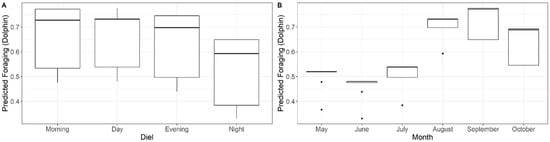 FPH-based binomial GLM. The predicted probability of dolphin foraging at Brandon Bay according to: (A) the time of day, where the four categories of diel phase are “Morning”, “Day”, “Evening”, and “Night”; (B) Month, from May to October. Predicted foraging is measured by the proportion of foraging positive hours, which are hours containing at least one click train with a minICI < 10 ms.