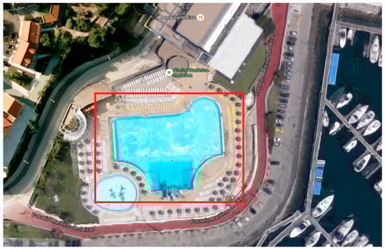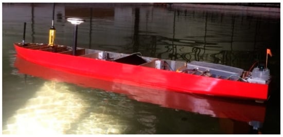 The collision avoidance test is carried out using a free-running ship model, which was described in Section 2. The sensors and actuators are installed on the ship model, as presented in Figure 4. The control system is programmed in Labview platform. The test was carried out in a swimming pool, as described in Figure 16. The maximum length is 50 m and the width is 20 m, the depth is 1.2–1.8 m.