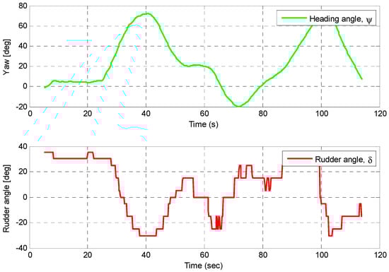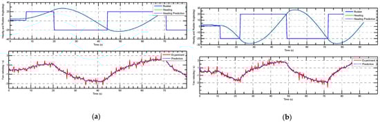 The zigzag manoeuvring tests, as suggested by ITTC [49], were conducted in the tank of Laboratory National de Civil Engineering (LNEC). The results are presented in Figure 5. Then, the least square support vector machine (LS-SVM), [50,51], was employed to identify the parameters. More details can be found in [46]. One test is used to estimate the parameters, as shown in Figure 5a. The results agree well with the training test. The obtained values of the Nomoto parameters are given: T = 7.7515, n3 = 0.0669, K = 0.1129. To validate the results, a new zigzag manoeuvring test was chosen as a test set. This test was not used for the training. The validation result is presented in Figure 5b. The prediction agrees well with the tests. In the training and validation process, the heading angle is the integration of the yaw rate, which is the prediction of the obtained Nomoto model. Therefore, in order to eliminate the accumulated error due to the integration, one step prediction is adopted when calculating the yaw heading.